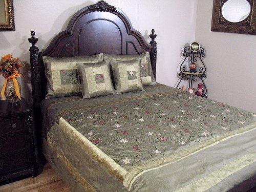 A dazzling Bedspread set that is guaranteed to leave you spellbound! Workmanship so thAbsolutely Stunning hand embroidered vibrant Army Green 5 PC Shimmering Indian Bedding Bedspread set in Queen size with floral embroidered patterns and matching Pillow Shams & Cushion Covers in Dupion Silk - Exquisite embroidery from Lucknow, India : Size 106" x 90" (Queen / Full sized beds)